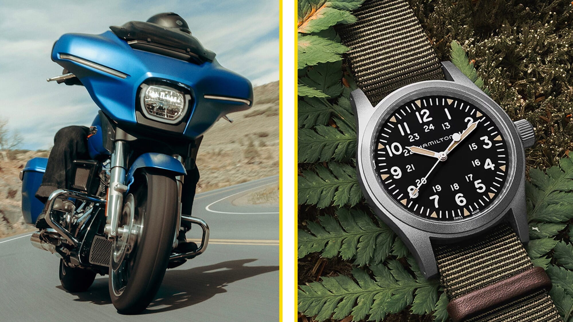La Harley Davidson Street Glide (o più in generale, la storica gamma Touring) richiama l’anima di un Hamilton Khaki Field, e anche qui non si tratta solo dell'origine statunitense di entrambi, ma soprattutto per il gusto per la tradizione reinterpretata in chiave contemporanea. La Street Glide è turismo americano puro, fatto di linee iconiche, comfort e tradizione; il Khaki Field porta al polso dell'appassionato un’eredità militare con un design semplice, iconico e senza tempo.