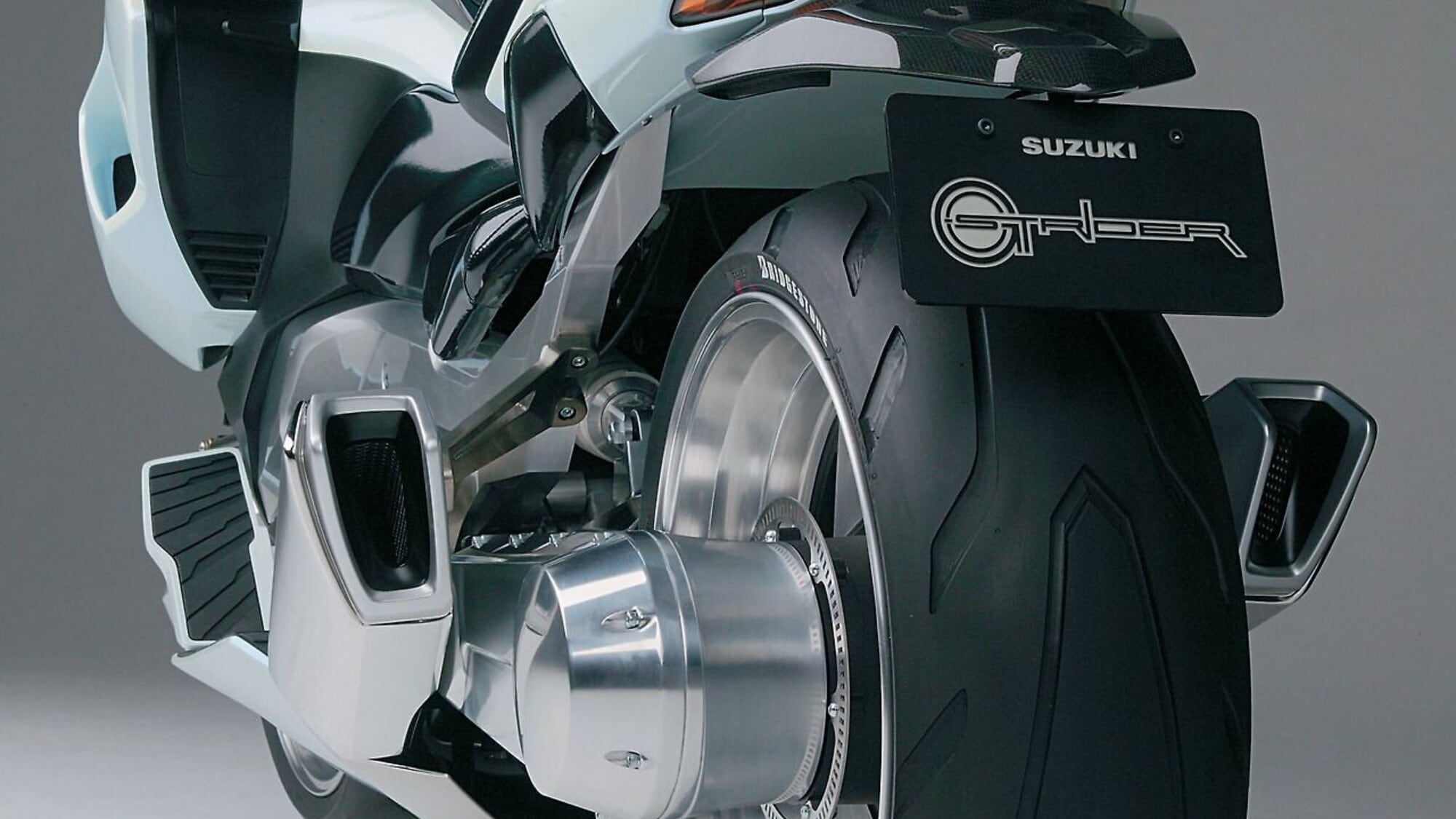 Le dimensioni però portavano la G-Strider assolutamente fuori da ogni canone: 2.445 mm di lunghezza, 1.800 mm di interasse (!) e una sella bassissima a soli 615 mm da terra. Numeri superiori a quelli di qualsiasi altra moto sul mercato (una Goldwing non arriva 1.700 mm di interasse) che avevano bisogno di una ciclistica unica per essere gestiti. All'anteriore campeggiava un forcellone con sterzo sul mozzo ruota, e al posteriore faceva bella mostra di sè un imponente ruota 220/40 R18.