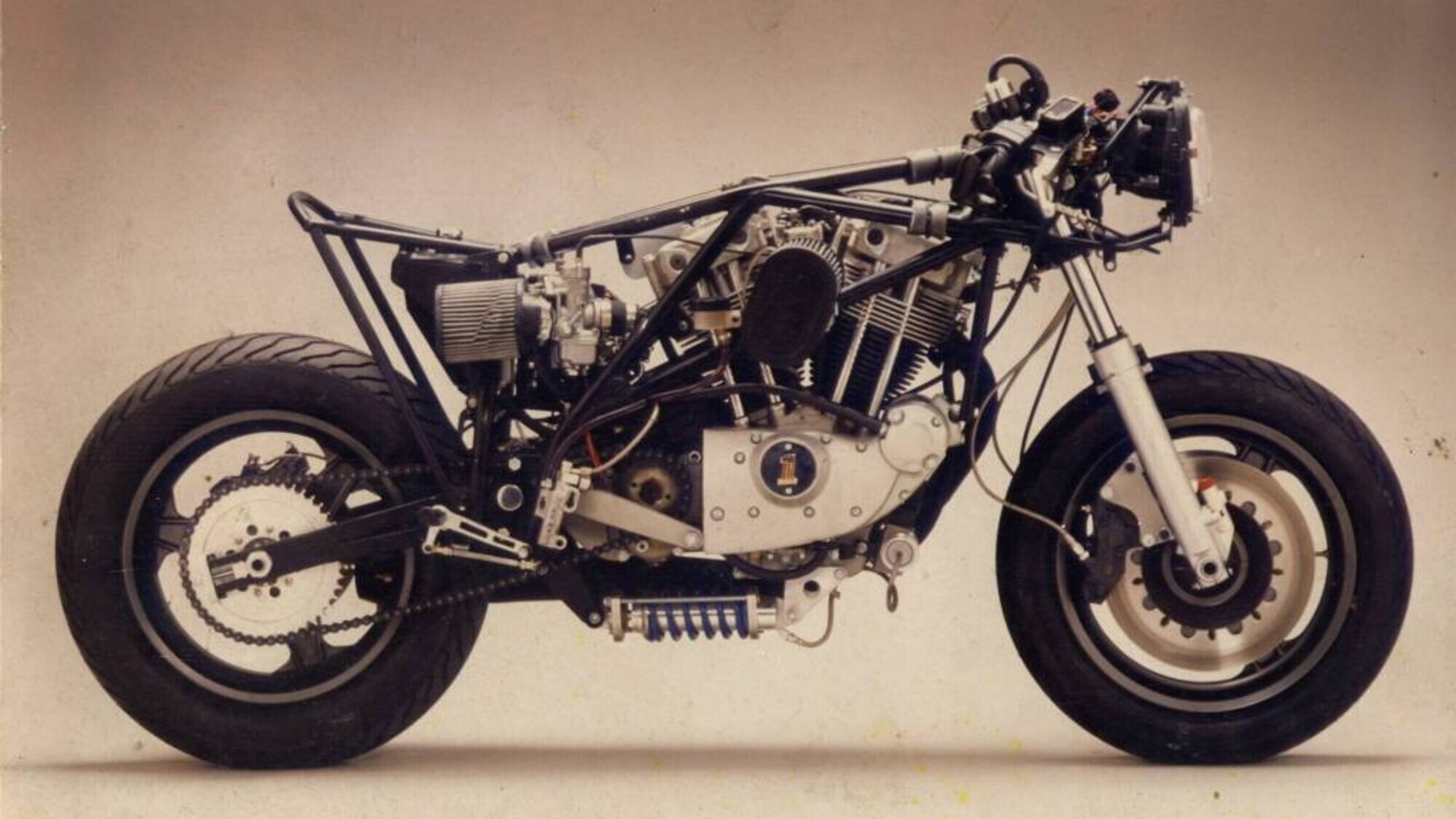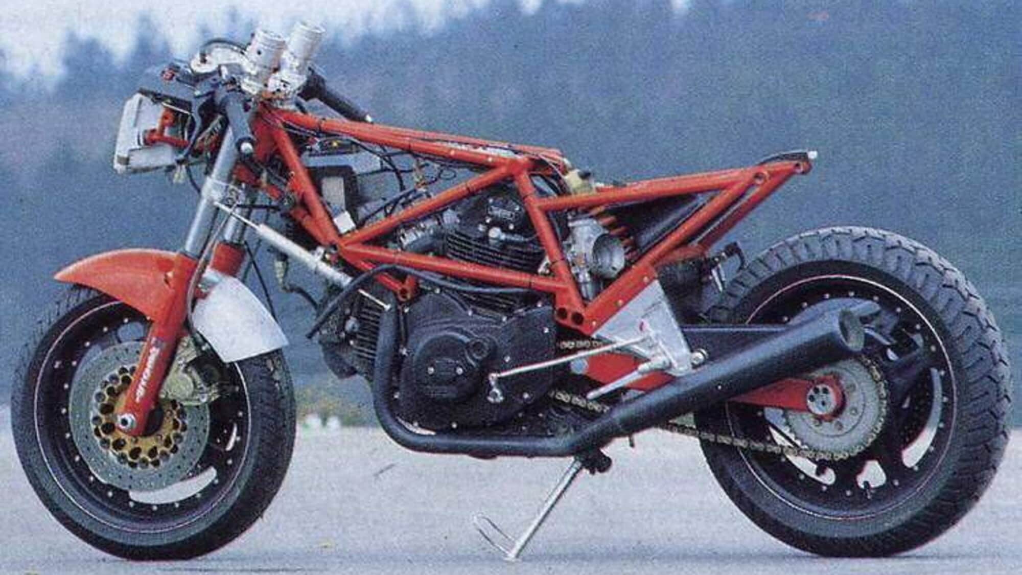Nel 1987, dall’altra parte dell’oceano, Erik Buell propose qualcosa di completamente diverso con la RR 1000 Battletwin della sua ancora giovane factory. Il motore era l’XR1000 di casa Harley-Davidson: un V-twin da 998 cc raffreddato ad aria, portato a circa 70 CV e decisamente più massiccio rispetto al Desmodue italiano.